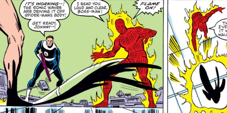 La Antorcha Humana usó sus llamas para evitar que el simbionte escapara y pudieron colocarlo en un campo de contención especial. Pero el simbionte escapó y buscó venganza contra Spider-Man, lo que llevó a su eventual vínculo con el reportero Eddie Brock.