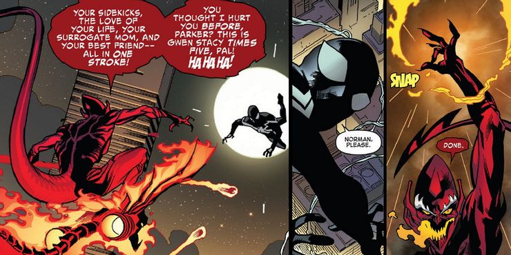 Peter Parker escapó de vincularse con el simbionte en los años 80, pero muchos años después, voluntariamente se unió al extraterrestre para luchar contra el Duende Rojo. El Red Goblin es una aterradora fusión del simbionte Carnage y el Green Goblin, Norman Osborn.