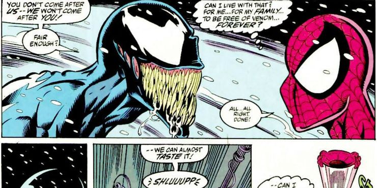 Spider-Man y Venom acuerdan mantenerse alejados el uno del otro después de que Spider-Man salva la vida de la ex esposa de Eddie Brock, Anne Weying. Venom también se asoció con Spider-Man para derrotar a Carnage, un engendro del simbionte Venom, después de que se embarca en una horrible ola de asesinatos en el Matanza máxima crossover cómico.