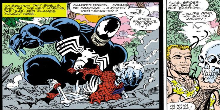 En El asombroso Hombre Araña # 347 de 1991, una gran batalla entre los dos cae en una isla desierta. Superado y temeroso de que Venom lleve la pelea a sus seres queridos, Peter Parker toma la medida extrema de plantar su traje desgarrado en un esqueleto. Esto funciona, y al menos por un tiempo. Venom cree que ha logrado matar a su enemigo más odiado.