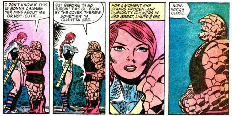 The Thing establece una conexión instantánea con Sharon porque le recuerda a Tarianna, una mujer que conoció en Battleworld. El impresionante guerrero se manifestó desde su propio subconsciente como todas las cosas en Battleworld, donde Ben Grimm permaneció durante algún tiempo después de la guerra de 1985. Guerras secretasentre los eventos más importantes de Marvel Comics.