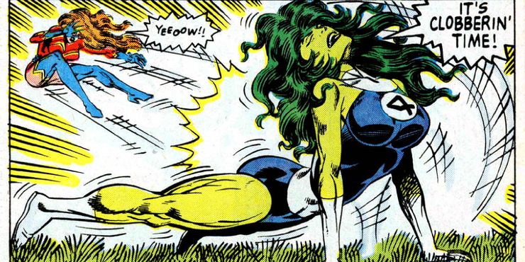 Las dos mujeres luchan entre sí hasta detenerse y esta lucha desde La cosa # 36 potencialmente sirve como una historia cómica que el próximo Ella Hulk La serie de streaming se adapta. Con The Power Broker en el MCU, ciertamente es posible.