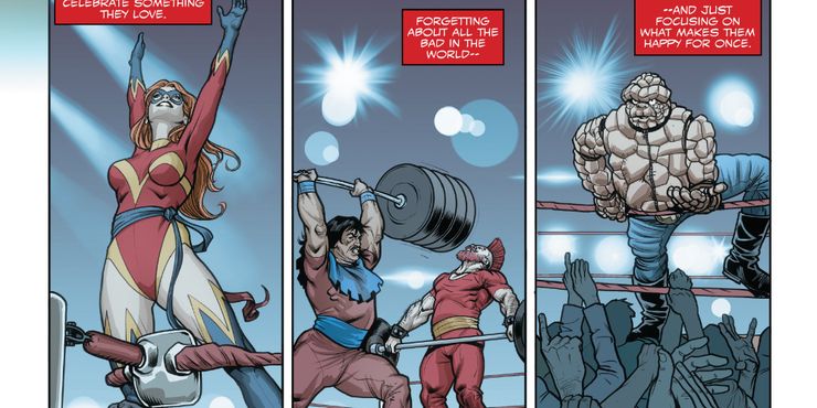 Ms. Marvel pone a prueba sus nuevos poderes inmediatamente contra She-Hulk. Los dos héroes luchan entre sí durante un momento confuso en el que Sharon y Ben Grimm escapan de los Grapplers. En ese momento, The Thing sufre una gran transformación, dejándolo dolorido y She-Hulk pensando que es la víctima de Sharon.