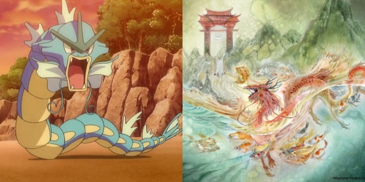 Muchos fans de Pokémon rojo y Azul se sorprendieron cuando Magikarp, el peor Pokémon combativo de la serie, se convirtió en el increíblemente fuerte Gyarados, uno de los mejores Pokémon resplandores en la franquicia. Si bien sus apariencias físicas no se parecen entre sí, la extraña evolución es una referencia a la clásica historia china de la Puerta del Dragón. En esta historia, la Puerta del Dragón se asienta sobre una cascada, y cualquier carpa que sea capaz de perseverar en la escalada y saltar por encima de la puerta es recompensada convirtiéndose en poderosos dragones. Esta historia está aún más claramente referenciada en el original. Pokémon Snap, en el que los jugadores podrían evolucionar a Magikarp tirándolo a una cascada.