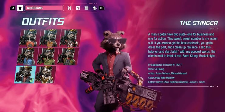Basado en su Once del océano-atuendo inspirado en la portada de Cohete # 1, el traje es uno de las docenas de atuendos y disfraces desbloqueables que aparecen en Square’s Guardianes de la Galaxia videojuego. Definitivamente no es el más extraño de la lista, pero es fácilmente el más elegante.