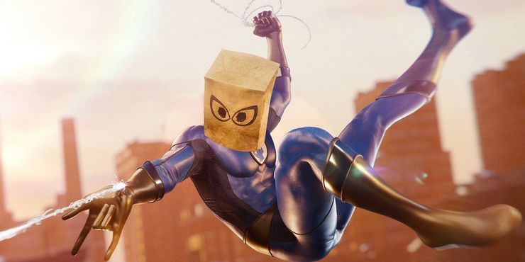 Hay astucia, no es práctica, pero también hay una tontería. Hecho de un traje de repuesto de Los Cuatro Fantásticos y una bolsa de papel con agujeros para los ojos, esta piel, disponible en Spider-Man de Marvel, no es exactamente la prenda más favorecedora del armario de Peter Parker.