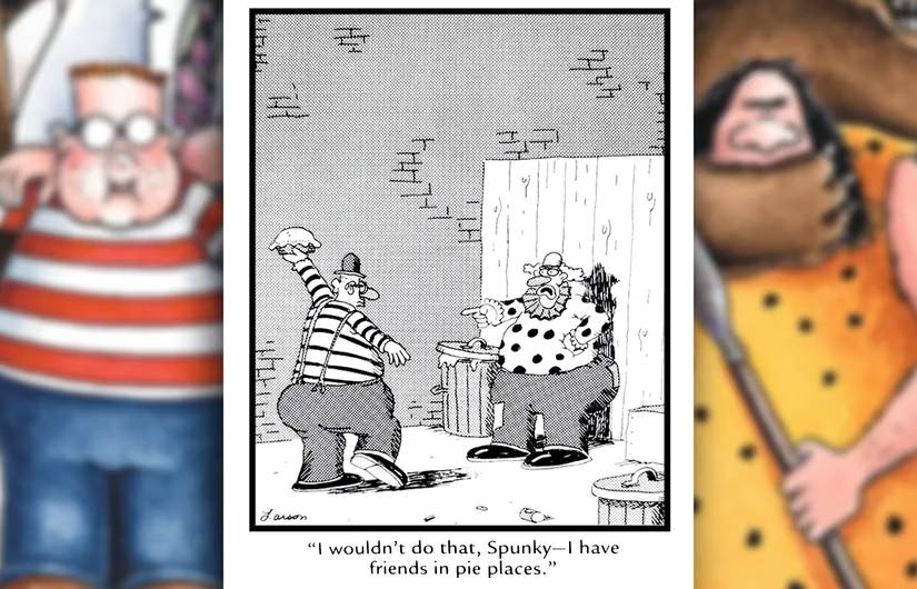 Larson calificó este cómic como el peor que jamás haya dibujado, y definitivamente es más cursi que su producción habitual. En El lado opuesto completo, Larson señala, “Arriba está mi propio candidato a la peor caricatura que he dibujado (todavía me estremezco)”. El chiste es puro juego de palabras, con un payaso advirtiendo a otro que tiene “amigos en lugares de pastelería” para intimidarlo. Definitivamente se encuentra entre las entradas menos ingeniosas de Larson, pero eso la convierte en un excelente material de broma para padres.