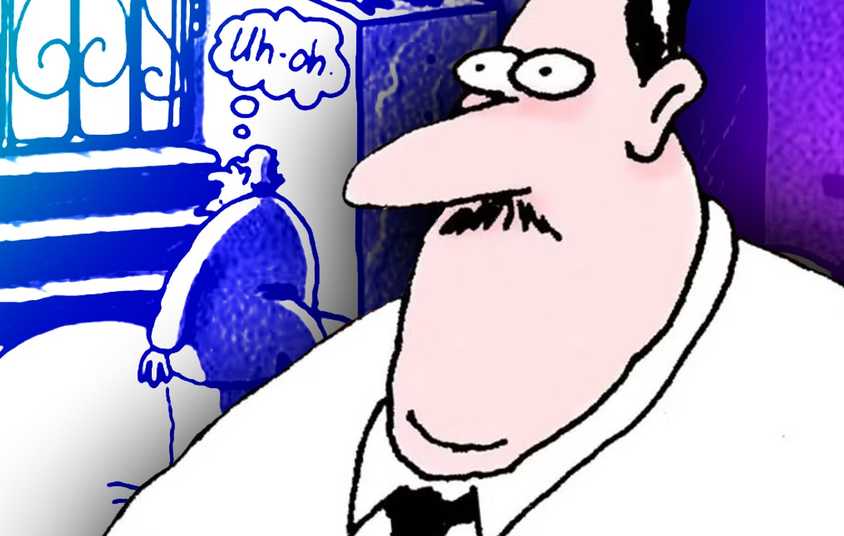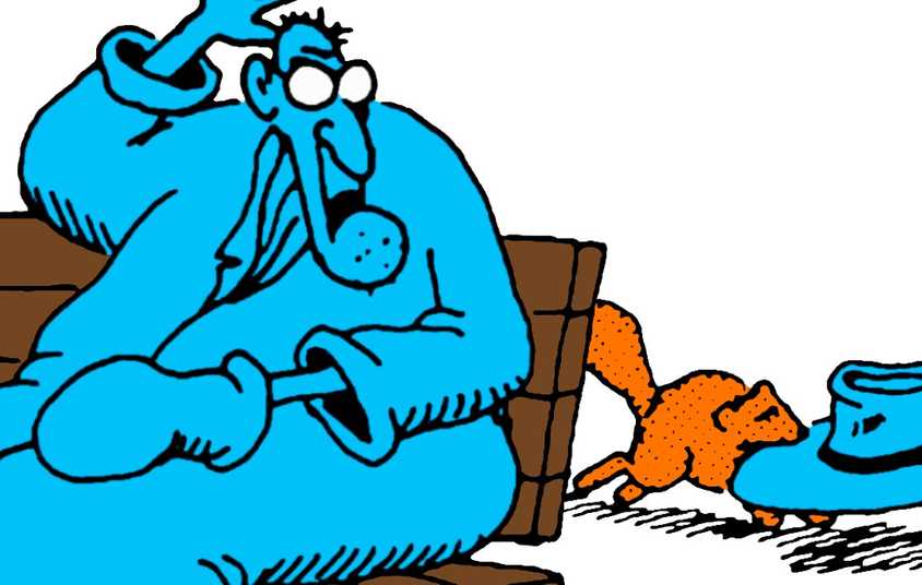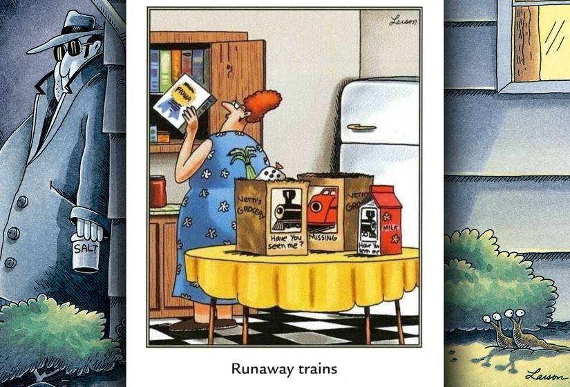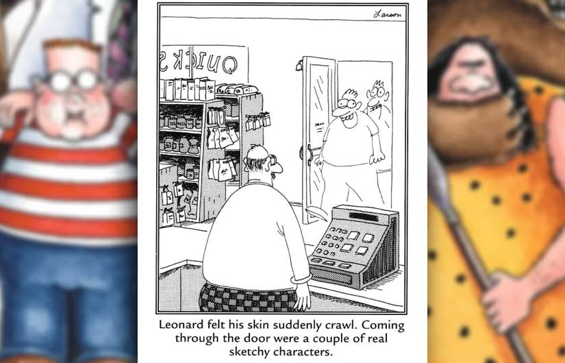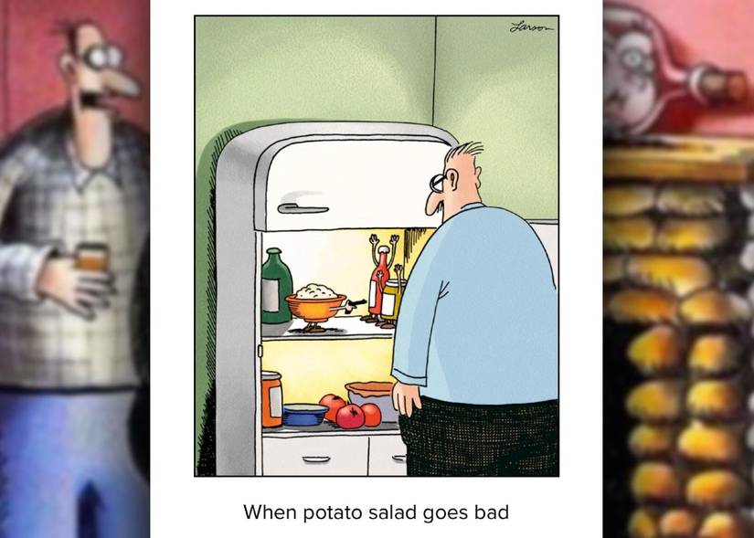 En una broma definitiva sobre papá, Larson hace un juego de palabras con los dos significados de “se ha echado a perder”, describiendo tanto el deterioro de los alimentos como a alguien que ha decaído moralmente. Si bien la broma es puro juego de palabras, Larson agrega un toque extra al hacer que su personaje humano tropiece accidentalmente con un robo de comida en progreso, a la altura de Lado lejanoEl estándar de humor visual.