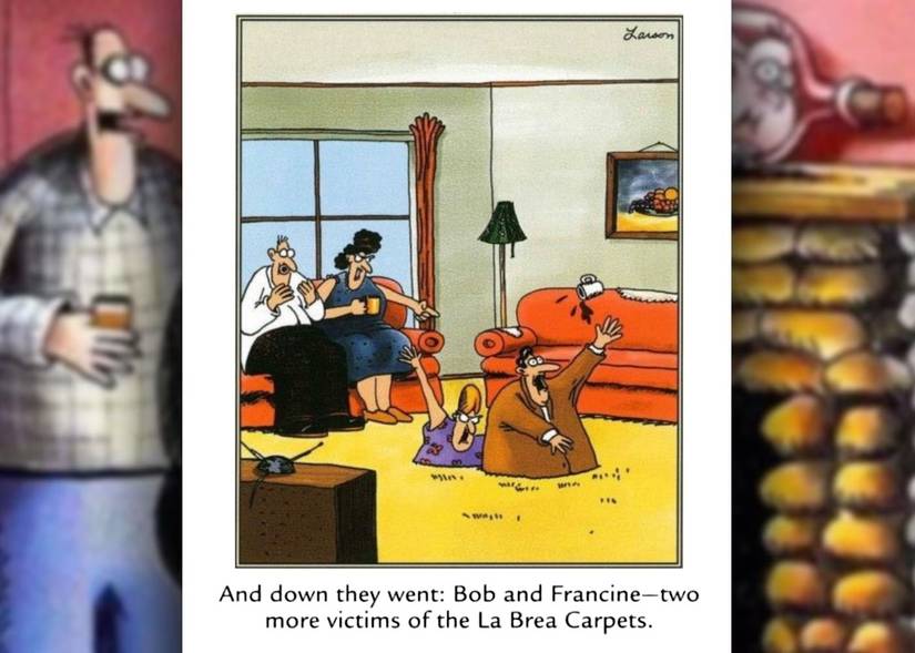 Este cómic es un juego de palabras con La Brea Tar Pits, antiguos pozos de alquitrán en Los Ángeles que han estado tragando y preservando varios animales durante decenas de miles de años, y los especímenes ahora son recuperados y estudiados por paleontólogos. El otro lado Le encanta chocar lo verdaderamente surrealista con lo innegablemente mundano, con dos personas inocentes tragadas hasta la muerte después de pisar la alfombra equivocada. Es inquietante que sus anfitriones debieran haber conocido los riesgos, pero no ofrecieron ningún tipo de advertencia.
