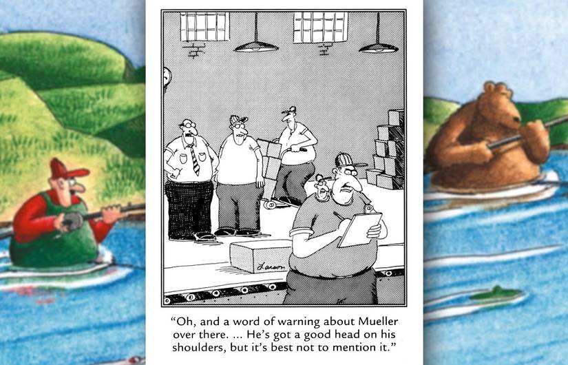 El otro lado tiene un lote de cómics donde Larson toma un modismo y lo traduce literalmente. En este caso, la buena cabeza sobre los hombros de un trabajador no es una felicitación por ser sensato, sino más bien un pequeño doble mutante.