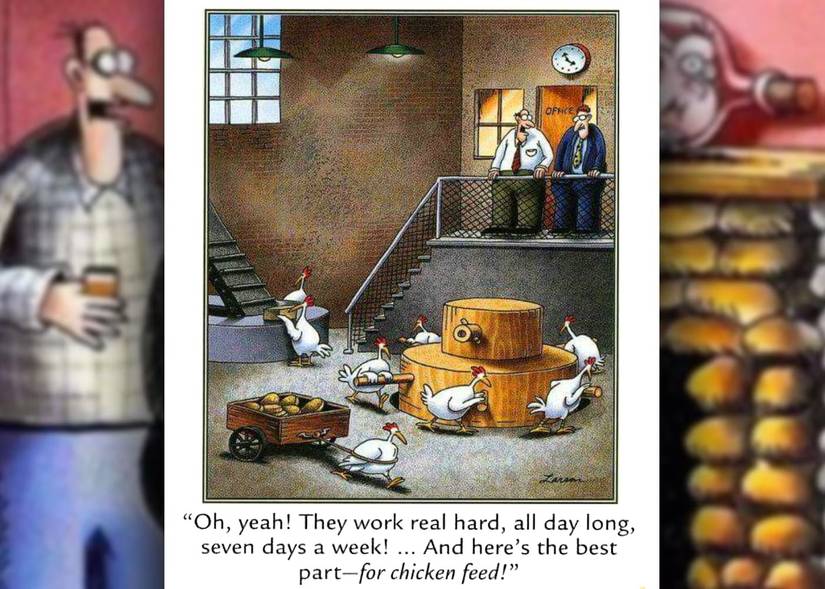 En esta tira, un jefe se jacta de su nueva fuerza laboral: un ejército de gallinas que están literalmente dispuesto a trabajar para la alimentación de pollos. Las gallinas suelen ser las perdedoras en el mundo de Lado lejanocon Larson haciendo referencia al hecho de que sus personajes de aves de corral existen para ser comidos y, en un mundo donde los animales tienen inteligencia humana, no pueden evitar saberlo.
