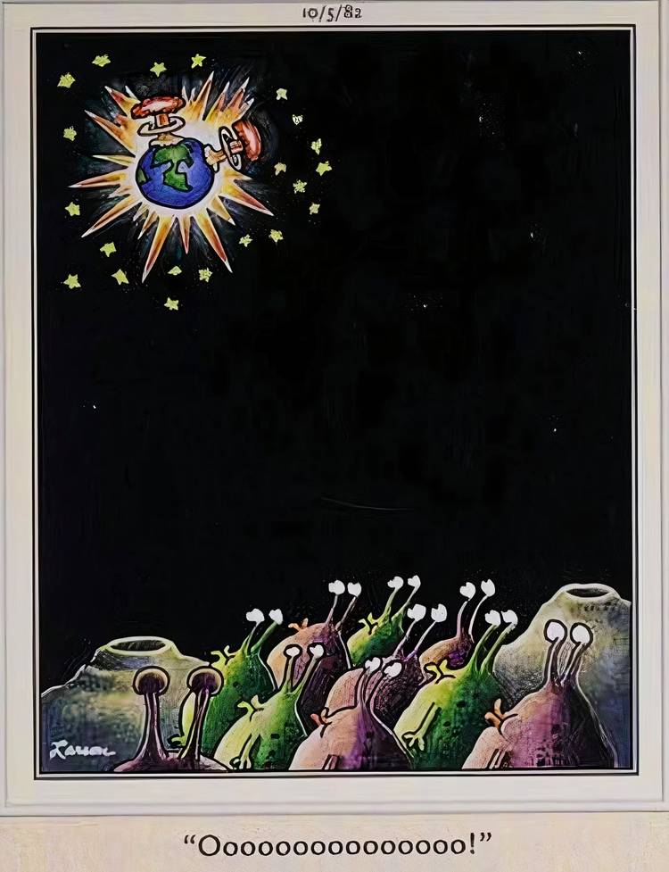 Gary Larson representó con frecuencia el fin del mundo, y algunas de sus mejores caricaturas de “Armageddon” adoptaron una perspectiva externa de la autodestrucción de la humanidad. Este es el principal ejemplo de ello, ya que este Lado lejano dibujos animados presenta a un grupo de extraterrestres que observan con asombro cómo la Tierra estalla en una espectacular explosión, y las nubes en forma de hongo de las bombas nucleares florecen en todo el mundo..