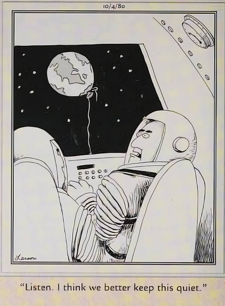 Aquí, Gary Larson representa a un custodio gigante de color púrpura limpiando la luna, lo que incluye atravesar el módulo de alunizaje dejado atrás por los EE. UU. como cualquier pedazo de basura espacial. Sin necesidad de un título, esto Lado lejano El panel expresa perfectamente la perspectiva de Larson sobre cómo la humanidad encaja en el orden jerárquico cósmico.