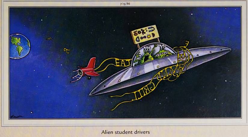 Volviendo a la idea de la Tierra como un desvío, este Lado lejano El cómic extraterrestre lleva la leyenda: “conductores estudiantes extraterrestres“, y presenta un sauer volador que ha realizado un peligroso paso por la Tierra.. Este panel se burla de una situación humana familiar (adolescentes aprendiendo a conducir y el terror que sigue), pero al utilizar extraterrestres para lograr ese resultado final, el subproducto es que Gary Larson ofrece otro recordatorio de que la humanidad es parte del remate para el resto. del universo.