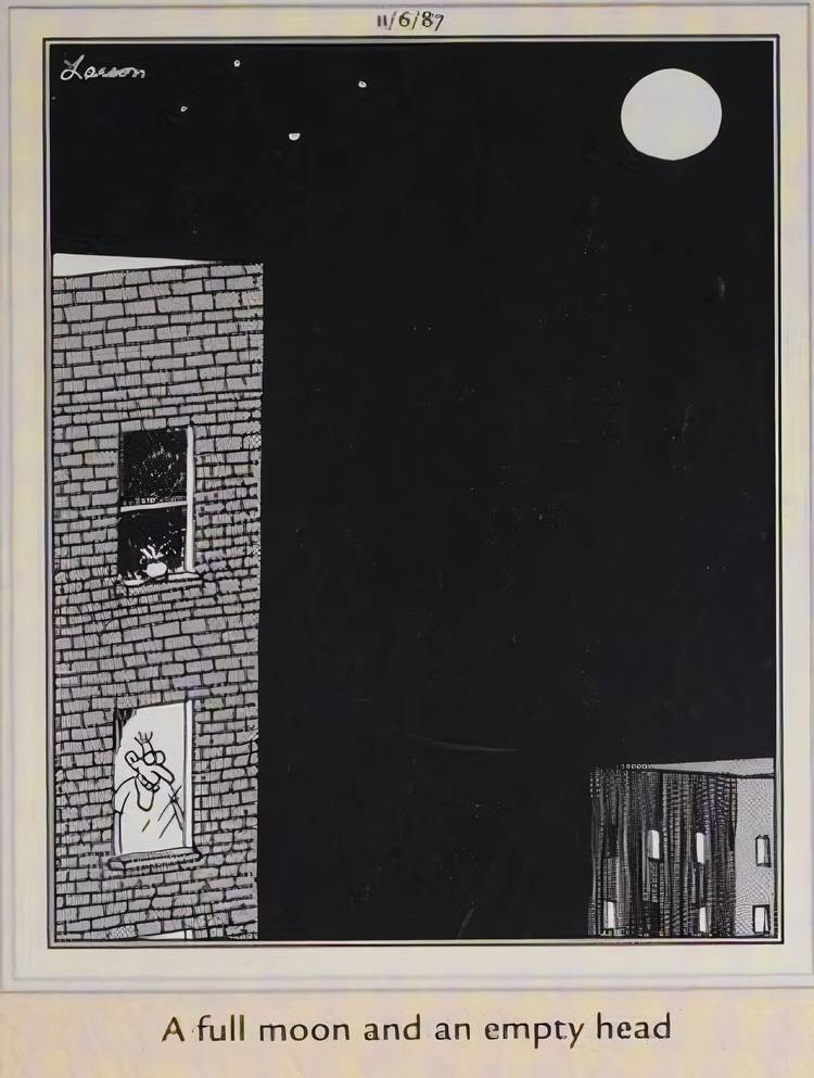 Este Lado lejano El panel contrasta la maravilla del universo con la naturaleza insípida de la experiencia humana, en lo que posiblemente sea una de las declaraciones más contundentes de Gary Larson sobre sus sentimientos sobre la humanidad. Subtitulado, “una luna llena y una cabeza vacía” el panel representa exactamente eso: una luna llena vibrante en la esquina superior derecha del marco, mientras que en la parte inferior izquierda, un hombre mira por la ventana de un apartamento con una expresión tonta y distraída en su rostro.