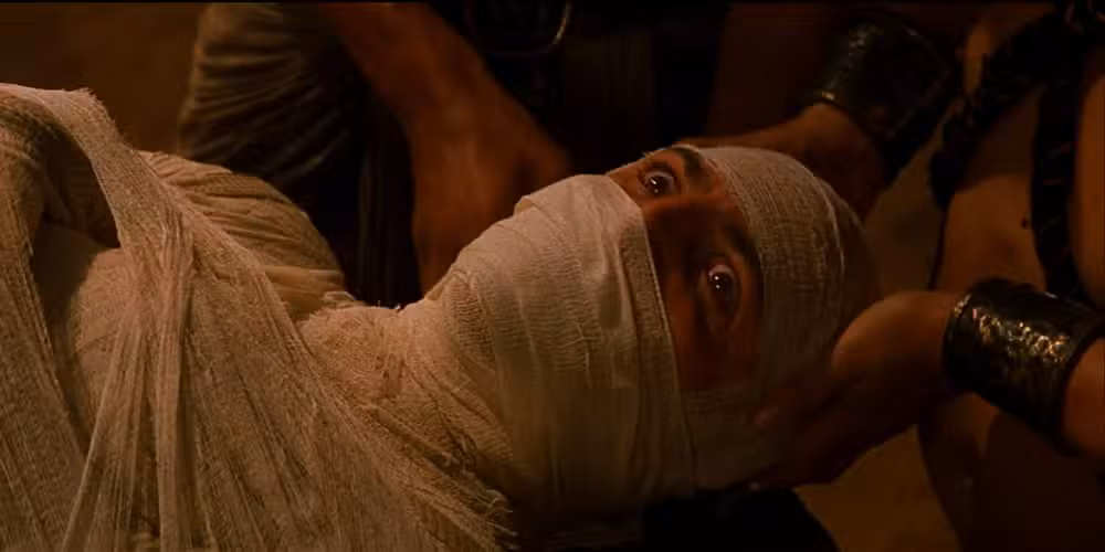 Durante la culminante escena final, cuando Imhotep pelea con Rick, lo arroja por una arena de piedra como si fuera un muñeco de trapo. Esos impactos romperían los huesos de un simple mortal, pero O’Connell les resta importancia cómicamente ya que son parte del plan.