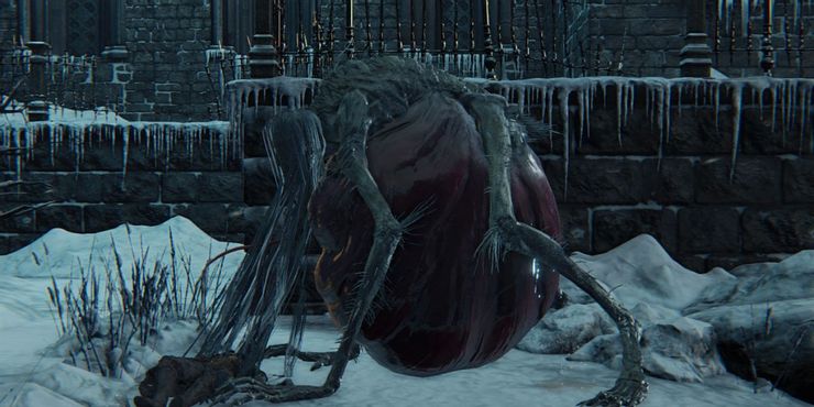 En términos de diseño, los jugadores tienen dificultades para encontrar una criatura más grotesca, incluso entre los jefes del juego. Estos enemigos no solo agarrarán y atacarán a los cazadores que pasan, sino que también escupirán picos sangrientos como un ataque a distancia. Tenga cuidado con las cajas de aspecto extraño en la Aldea Invisible, o asegúrese de llevar una de Bloodborne artículos más útiles, papel de fuego, que es su debilidad.