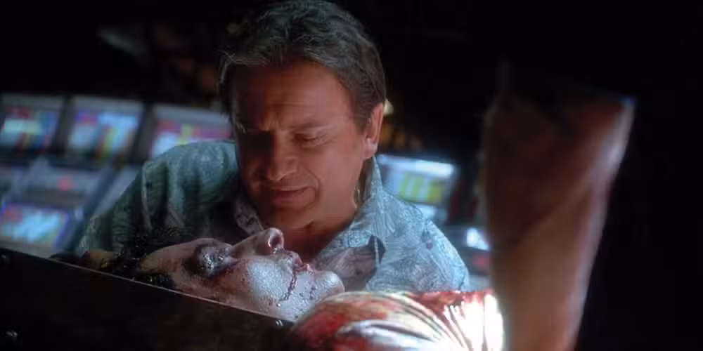 Pero la escena más emblemática de Casino es también su secuencia de violencia más sangrienta. Nicky trae a un matón a la parte trasera del Tangiers, le mete la cabeza en un tornillo de banco y lo gira hasta que se le sale el globo ocular. Es un reloj difícil, pero tremendamente efectivo.
