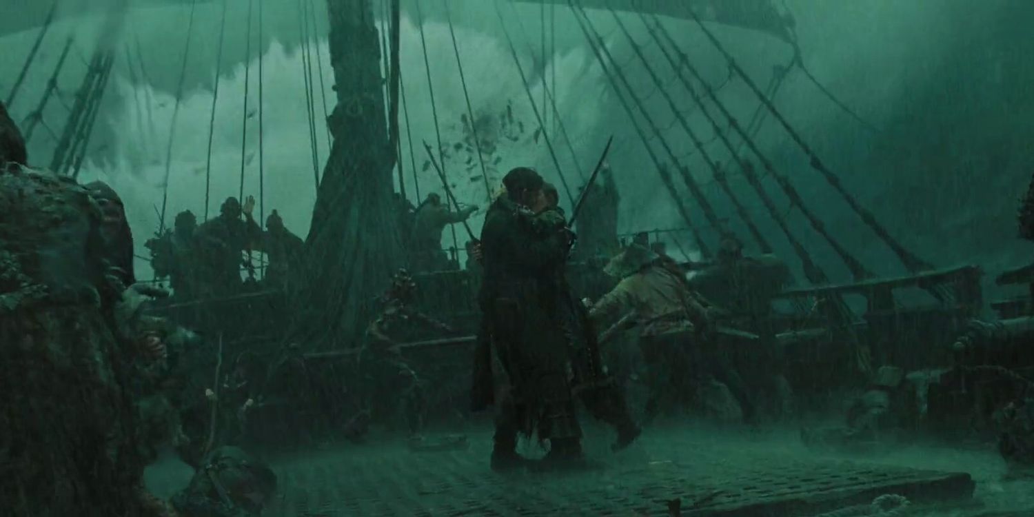 Como gran parte de la trama de las tres primeras películas está impulsada por el amor mutuo de Will y Elizabeth, era justo que se casaran en la tercera película. Después de su boda inicial a principios de El cofre del hombre muerto se frustra, la pareja se separa continuamente y se les impide declarar formalmente su amor. Finalmente, en Al final del mundoellos son se casaron en medio de una batalla épica a tres bandas entre ellos, Davy Jones y su equipo, y Lord Cutler Beckett.. El Capitán Barbosa realiza la ceremonia y la pareja pronuncia sus votos mientras ensarta a sus enemigos.