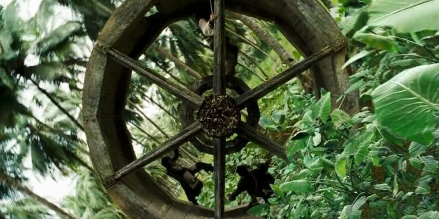 En El cofre del hombre muerto, los roles se invierten respecto a la entrada anterior, y Elizabeth y Will deben buscar a Jack y su brújula para dárselos a Lord Cutler Beckett (Tom Hollander). En el camino, Elizabeth y Will se ven arrastrados por el plan de Jack de encontrar el cofre que contiene el corazón de Davy Jones (Bill Nighy) y terminan en la isla en la que está enterrado, junto con Beckett. jAck, Will y Beckett luego luchan por el cofre en la isla., utilizando una rueda hidráulica gigante como escenario. Rodan por la jungla en una de las escenas de lucha más atractivas de la serie.