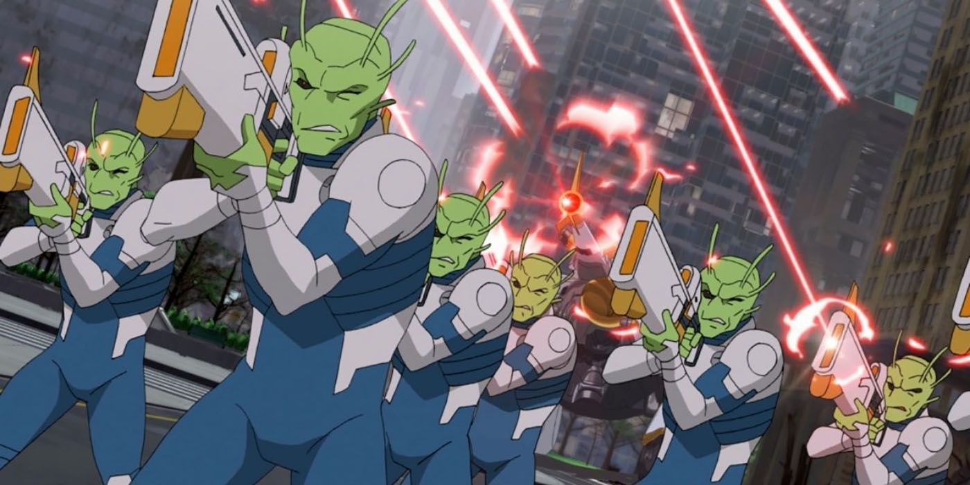 Temprano en Invencible, Mark pasa por pruebas iniciales para ver qué tipo de héroe será, y su primera gran batalla con los Flaxans casi lo elimina. No importa cuántas veces él y sus amigos los derroten, ellos regresan unos segundos después, más inteligentes y más fuertes que nunca. La batalla diezma una ciudad y requiere una enorme cantidad de Flaxans. descender sobre la ciudad en masa. Es un caso en el que la animación se adapta bien a la narración debido a la cantidad de daño que se puede representar sin causarlo en la realidad.