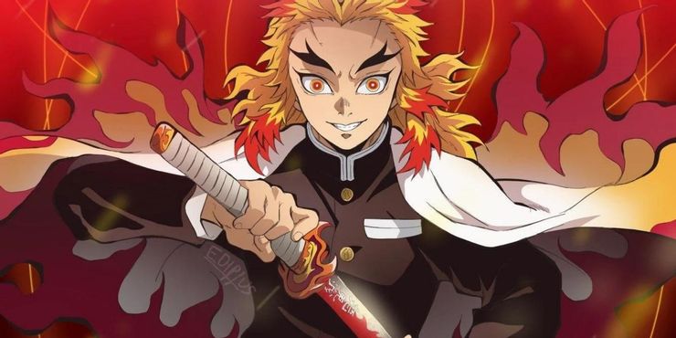 El rojo es el color característico de los usuarios de Flame Breathing, como Kyojuro Rengoku (con la voz de Satoshi Hino) y su padre y maestro Shinjuro. Rengoku era la llama Hashira y su katana Nichirin estaba hecha de mineral escarlata, y al igual que el otro, Hashira tenía las palabras Destructor de Demonios grabadas en el costado.