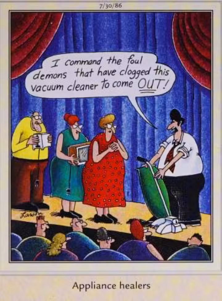 Subtitulado “curanderos de aparatos,” este Lado lejano La caricatura muestra a un hombre que hace milagros, arreglando artículos domésticos rotos simplemente imponiéndoles las manos. De esta manera, Gary Larson parodia la naturaleza escandalosa de la curación por la fe, al mostrar cuán absurda sería si se aplicara en un contexto alterado con riesgos mucho menores.