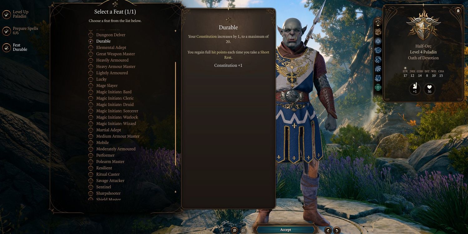 Durable es una gran hazaña para cualquier clase en Puerta de Baldur 3 pero es especialmente efectivo con personajes de primera línea y tanques. Durable permite al paladín aumentar su puntuación de Constitución en uno y permite recuperar todos los puntos de vida con descansos cortos. Esta es una hazaña útil si el paladín es el tanque principal del grupo y es realmente útil en áreas donde no es posible tomar un descanso prolongado.