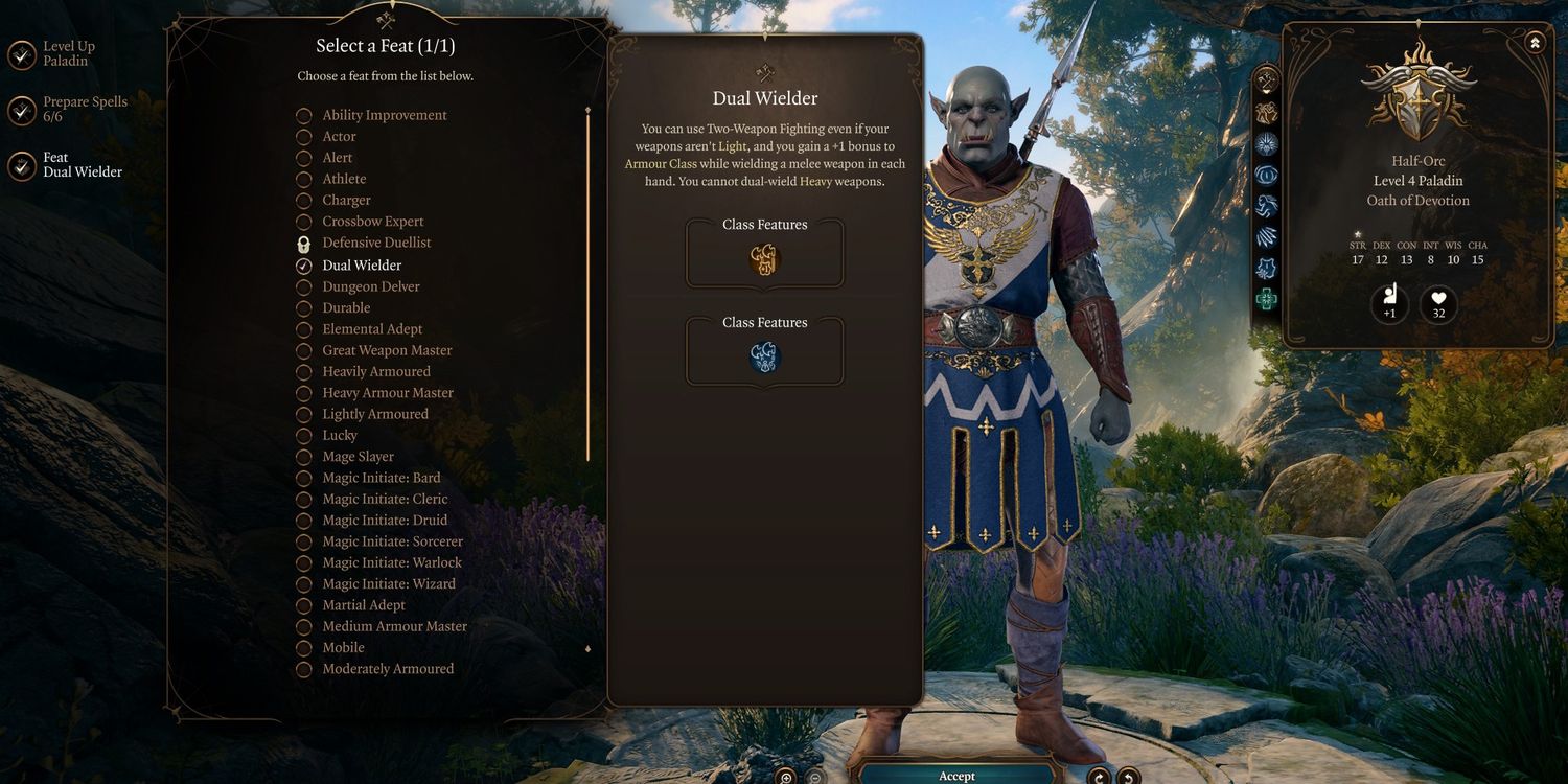 Dual Wielder es una gran hazaña para maximizar realmente la producción de daño y supone un cambio interesante con respecto a la configuración típica de paladín. Esta dote permite empuñar armas con ambas manos, incluso si no son armas ligeras. Dual Wielder también tiene una pasiva brillante que le da un más uno a AC cuando el paladín tiene dos armas cuerpo a cuerpo equipadas en ambas manos.