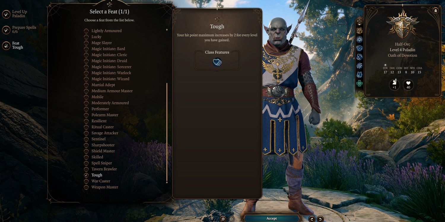 Tough es otro gran todoterreno. BG3 hazaña, al igual que una de las mejores opciones al principio del juego. Duro es bastante simple, ya que aumenta el máximo de puntos de vida del paladín en dos por cada nivel. Esto pronto se suma y puede convertir rápidamente a un paladín en un tanque muy efectivo hasta el final del juego. Puerta de Baldur 3.
