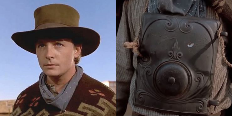 relojes biff Un puñado de dólares en Parte II y declara “cuánto ama el hecho de que el personaje de Clint Eastwood use una placa de acero como chaleco antibalas”. Entonces, en Parte III, se revela que Marty sobrevivió a un disparo del antepasado de Biff usando la misma técnica. ¡Los beneficios de la filmación consecutiva!