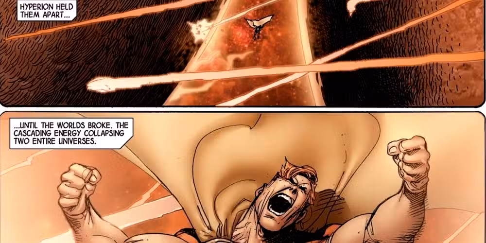 En Jonathan Hickman’s Vengadores Run, Hyperion intenta evitar que dos universos colisionen entre sí. Usando solo sus manos desnudas, Hyperion presiona contra la masa de toda una tierra que se acerca hacia las suyas, conteniendo momentáneamente un colapso multiversal completo. Aunque la colisión es inevitable, el hecho de que Hyperion lo retrase en absoluto es sorprendente.