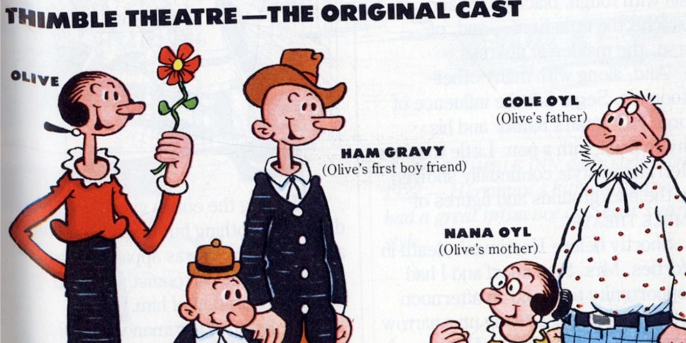 En los primeros días de la popeye tira cómica, cuando todavía era Teatro dedalla relación disfuncional entre Olive Oyl y su novio Ham Gravy, así como las aventuras y personalidades locas de la familia de Olive Oyl, fueron la principal fuente de contenido y humor de los cómics (a través de El diario de cómics). Junto con la familia Oyl y Ham Gravy, la tira tenía personajes secundarios secundarios que iban y venían. Popeye fue diseñado como uno de esos personajes, pero su inmensa popularidad lo convirtió en el elemento fijo de Teatro dedal antes de que se volviera completamente centrado en Popeye.
