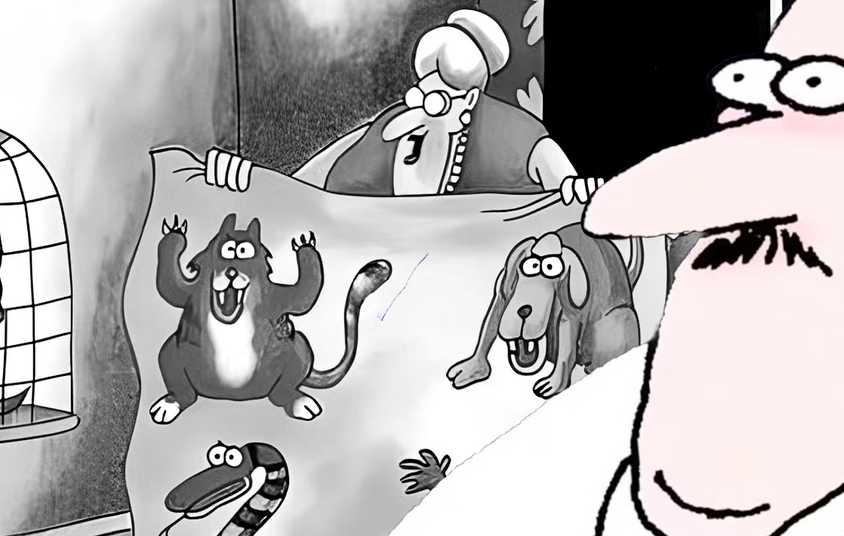 En el nivel del humor, que significa la premisa de la broma, es una patente Lado lejano Punchline, en la forma en que se extiende a horcajadas sobre el borde siendo tonto y absurdo; Sin embargo, en términos de ejecución, los lectores reconocerán por qué la ilustración necesitaba más espacio para transmitir la comedia de la imagen. La perspectiva permitida por este doble ancho Lado lejano La caricatura hace una gran diferencia aquí; Incluso si la broma solo es divertida, en lugar de riéndose y divertida, todavía tiene éxito, en lugar de falla, debido a su formato.