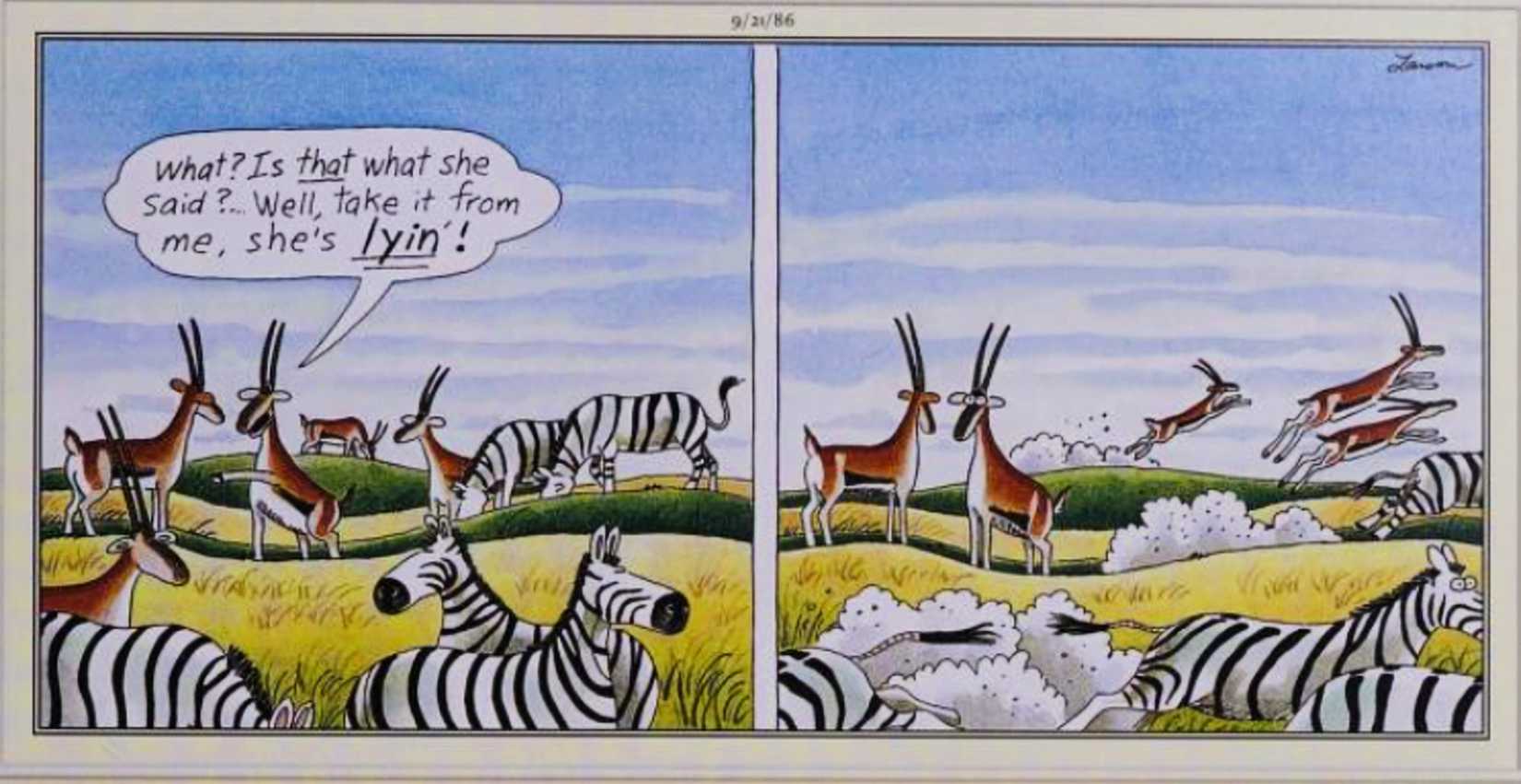 Este es un clásico juego de palabras de Gary Larson, uno que utiliza el espacio adicional que ofrece el puesto del domingo para dar a la broma dimensión adicional; Larson también usa un panel dividido con este Lado lejano Comic, para presentar dos momentos, en lugar de capturar solo uno, como fue su incumplimiento. En el primer cuadro, dos gacelas están hablando mientras otras gacelas, junto con una manada de cebra, pasta a su alrededor … hasta que Uno de ellos comete el error de decir la palabra “Lejía“Un poco demasiado fuerte, que los animales circundantes se mezclan como” león “, lo que hace que todos se dispersen.