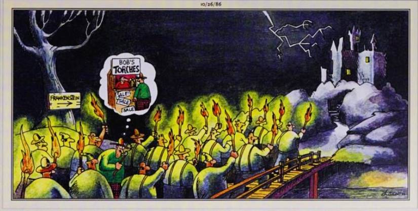 Este Lado lejano Sunday Edition le dio a Gary Larson espacio adicional para jugar con profundidad de campo en esta caricatura, uno de El lado lejano Muchos riffs en Frankenstein. Aquí, el monstruo en sí no aparece, sino que Larson se enfoca en el tropo de la mafia que empuña la antorcha, en camino de asaltar el Castillo del Doctor, que se representa muy lejos en la distancia.