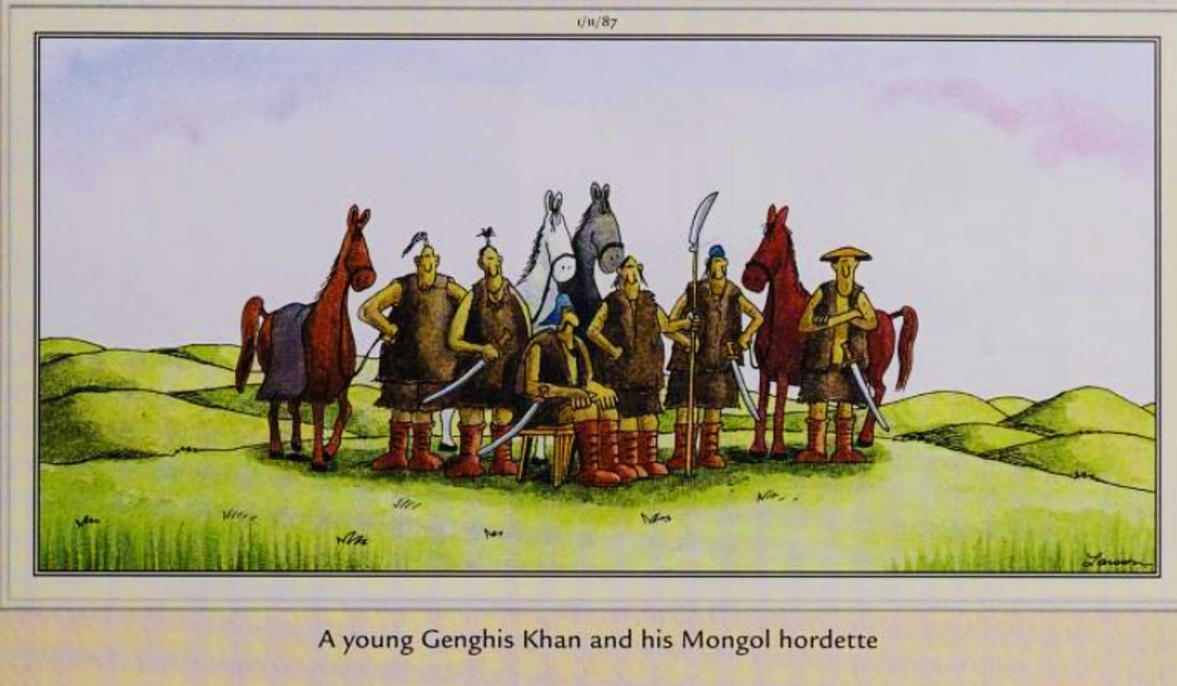 Gary Larson era un estudiante de historia, y eso se tradujo en muchos clásicos Lado lejano dibujos animados que hicieron burlas de figuras históricas, como esta, que características “un joven genghis khan y su hordeta mongol“Con el futuro conquistador infame en la foto, en este momento, con solo cinco tipos y cuatro caballos, a su lado.
