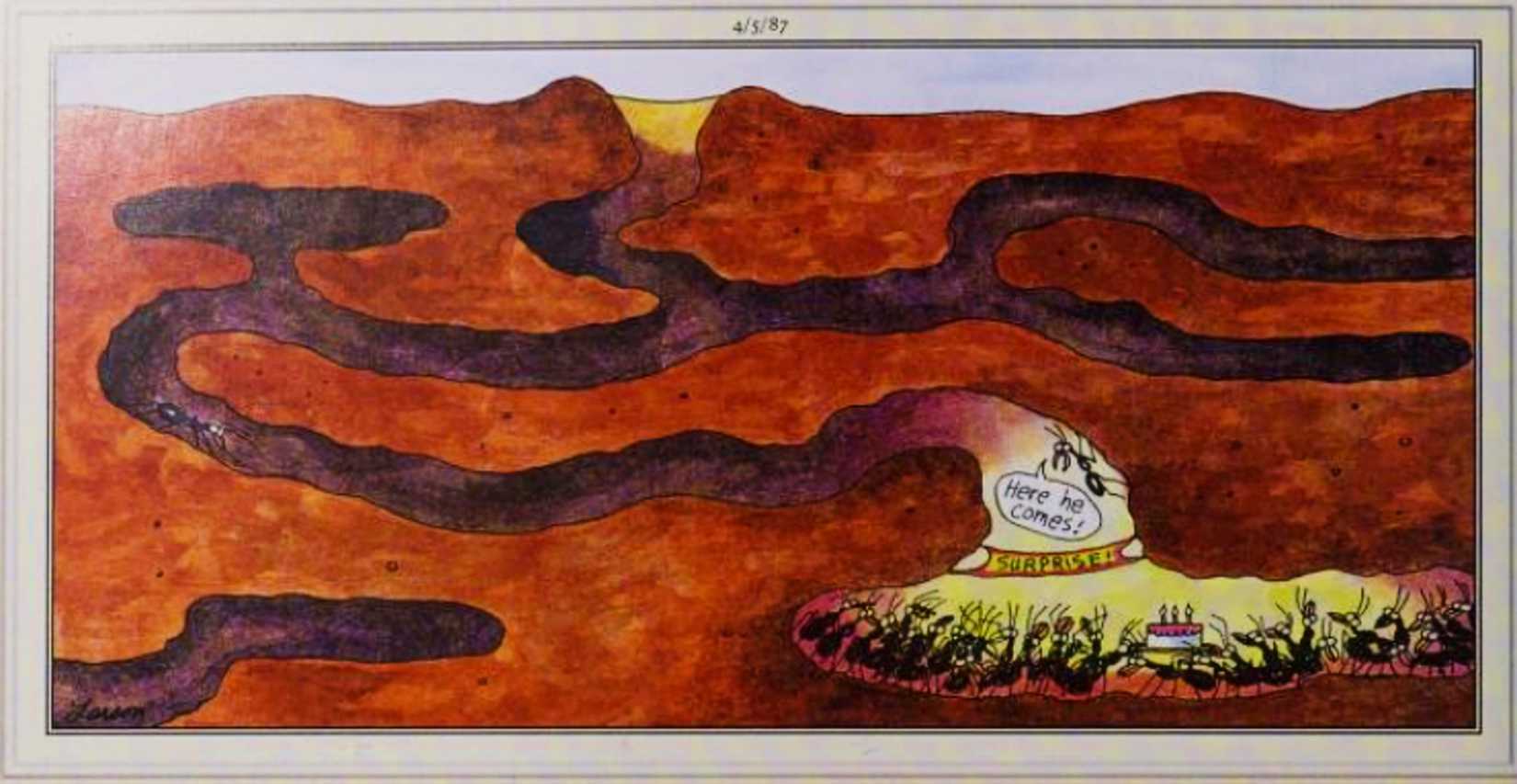 El uso frecuente de hormigas de Gary Larson como personajes, además de derivarse de su obsesión con los insectos, fue otro truco de perspectiva que usó. Al elegir los temas posibles más pequeños, podría transmitir el sentido de un mundo mucho más grande, incluso en el promedio Lado lejano Los confines limitados de Cartoon, y eso es doblemente cierto para esta edición del domingo.