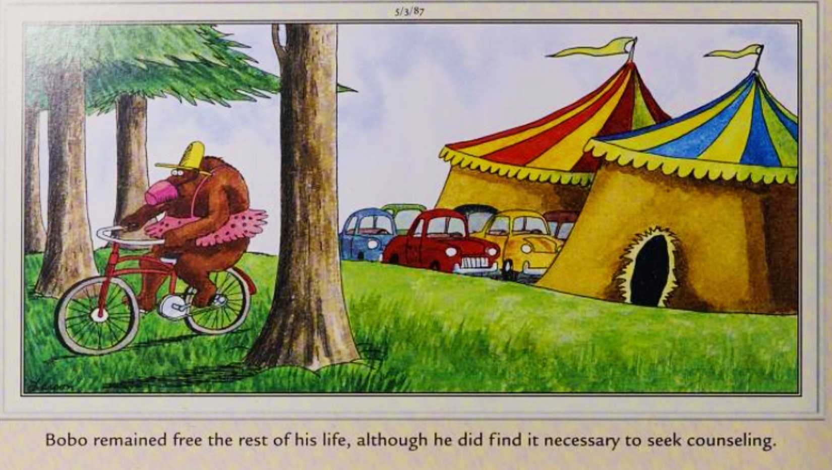 En este gran gran tiempo Lado lejano Bear Comic, un oso de circo que ha sufrido demasiada humillación a manos de sus captores finalmente Hace un descanso triunfante para la naturaleza, atravesando el costado de la tienda a mitad de rendimiento, andar en bicicleta mientras usa un tutú y un hocico rosa a juego, con un sombrero amarillo.