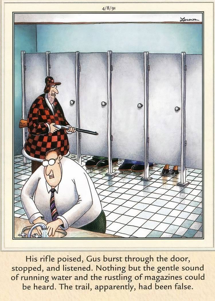 De acuerdo, no aparece ningún cazador real en esta caricatura, pero el humor de la broma proviene de cuán omnipresente sería el miedo a los cazadores en una sociedad de ciervos. En este sentido, se encuentra con el mismo tema de los otros cómics de “ciervos contra cazadores” de Larson, al tiempo que le da un giro diferente a lo que había hecho anteriormente.