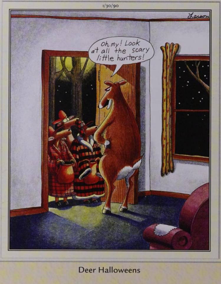 Subtitulado “Ciervos Halloween“Este espeluznante Lado lejano Características de bit Un grupo de ciervos adolescentes se vistió como la cosa más aterradora imaginable: los cazadores. Una vez más, Aritst Gary Larson usa el omnipresente abrigo a cuadros rojo y negro para significar visualmente a los cazadores, como los ciervos cuyos puertas están en comentario de truco o trato sobre cuán temibles son.