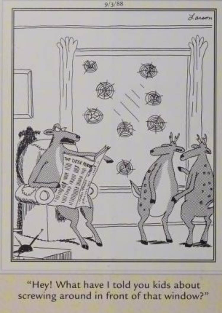 La ventana en cuestión está cubierta de grietas de Spider-Web de Bullets; Una vez más, Gary Larson juega con humor con la idea de que los Deer tienen que vivir sus vidas a pesar de la posibilidad ominosa y omnipresente de que un cazador de deporte le dispare, en un espejo oscuro de ansiedades humanas sobre la mortalidad en todas sus diferentes formas.