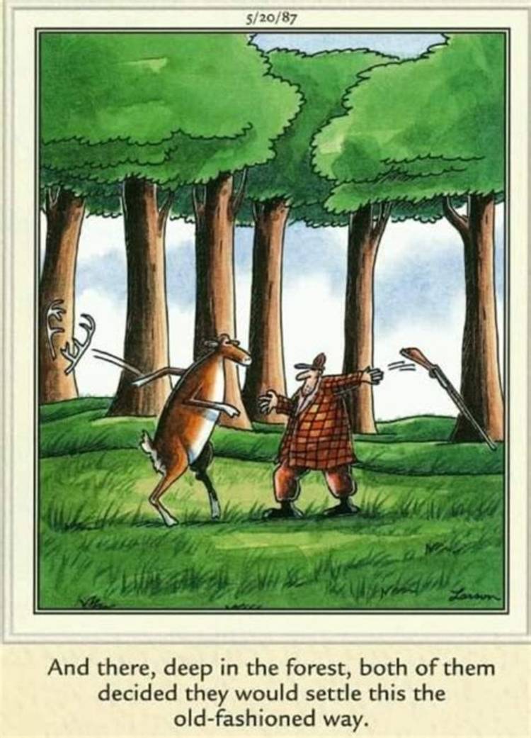 Cuando la gente piensa en Lado lejano Dibujos animados que enfrentan a los ciervos contra los cazadores, este es uno de los primeros en venir a la mente. Cuenta con una verdadera confrontación cara a cara entre representantes de cada lado, que tienen “Decidió que resolverían esto a la antigua“Después de venir el uno al otro”profundamente en el bosque“Donde nadie más está mirando.