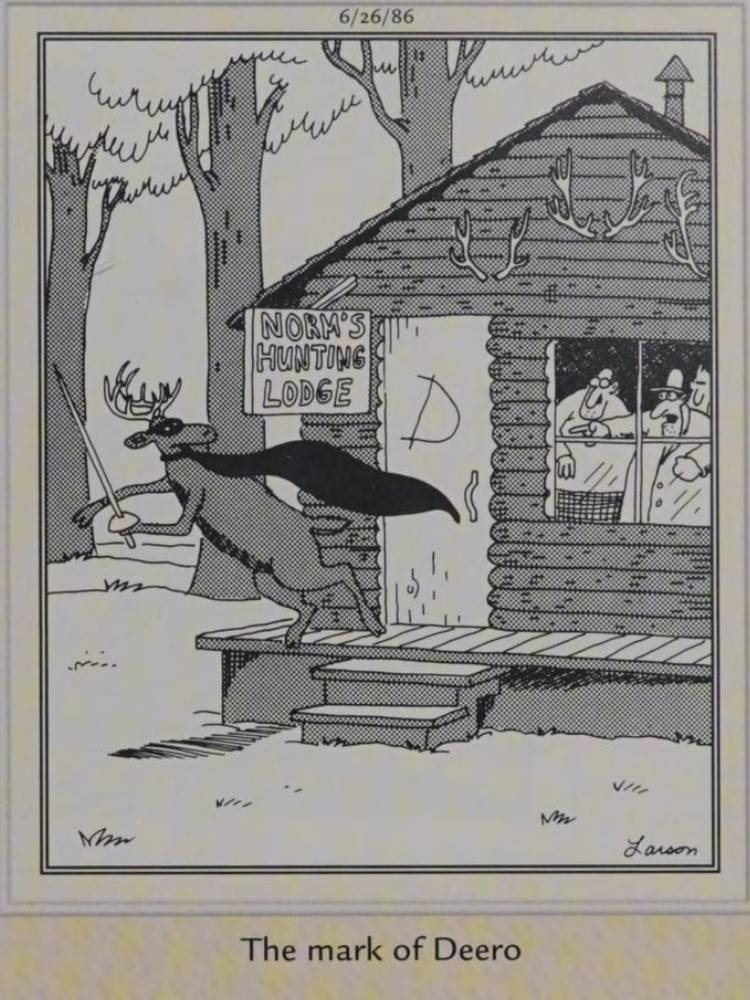 En este tonto Lado lejano Referencia de la película, “Zorro” se convierte en “Deero”, quien talla su firma “D“En la puerta de”Norma de caza“Antes de huir como un grupo de cazadores borese y señala la ventana desde el interiorincapaz de hacer nada sobre el vandalismo. Aquí, Gary Larson recontextualiza hilarantemente la dinámica de ciervos/cazadores.
