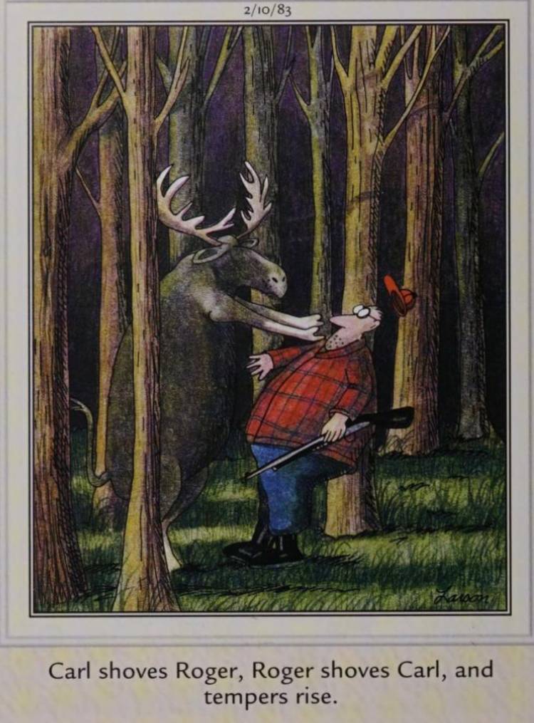 De acuerdo, técnicamente hablando, el personaje animal aquí se parece más a un alce, en lugar de un ciervo, pero la broma es, en esencia, lo mismo. Aquí, la criatura del bosque harta está cansada de ser cazada, por lo que se da vuelta y se enfrenta al cazador; “Carl empuja a Roger,“El subtítulo señala, nombrando de manera divertida al animal, entonces”Roger empuja a Carl y los temperatura se elevan“