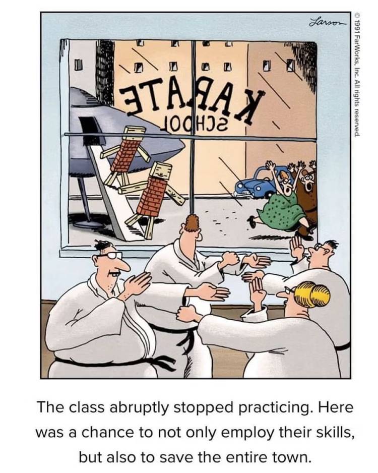 Quien no ha visto Entra en el dragón ¿Y pensaron que ellos también podrían ser Kung Fu Masters? Larson juega con la idea aquí en tEl lado lejano y muestra a un grupo de niños en un dojo aprendiendo karate. Entonces, como se esperaba en El lado lejanoAliens Invade y los estudiantes piensan que ahora es el momento perfecto para mostrar lo que pueden hacer con sus habilidades de artes marciales. Kung Fu fue increíblemente popular en el apogeo de El lado lejano popularidad, y parece que Larson está ridiculizando el enorme exceso de confianza de toda una generación de fanáticos mencionado en las películas de Bruce Lee.