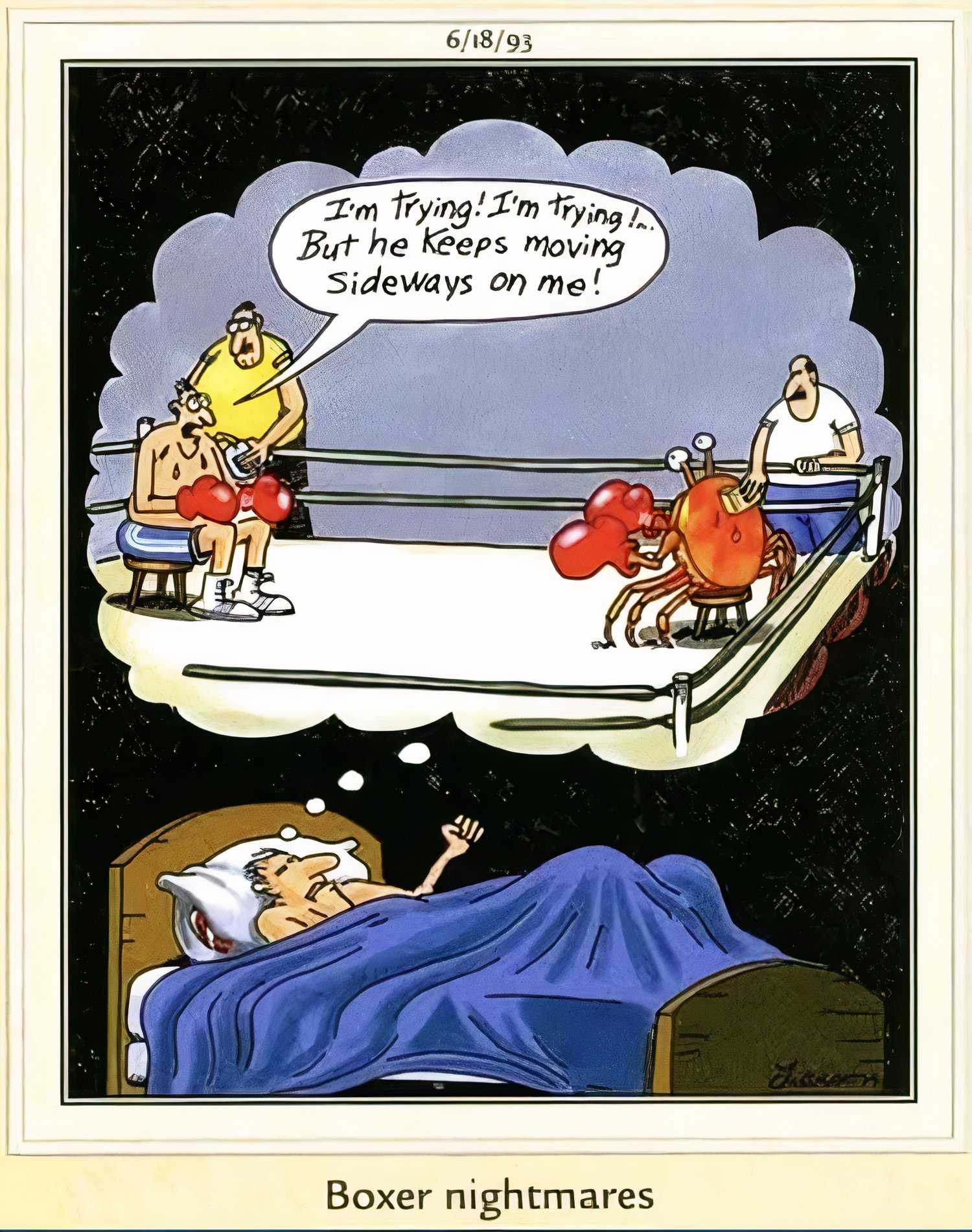 La película Rocoso Cubierto uno de los atletas deportivos más violentos que pueden pasar. Mientras que Rocky Balboa fue perseguido por sus propios demonios, El lado lejano decide torcer las cosas y hacer que su boxeer se enfrente a un tipo diferente de miedo. Mientras duerme, el boxeador tiene una pesadilla de enfrentarse a un oponente increíblemente difícil: un cangrejo que logra esquivar cada uno de los éxitos del boxeador. Larson aplica expertamente su amor por el reino animal a algo completamente no relacionado y es una parodia hilarante de una de las mejores películas de boxeo de todos los tiempos.