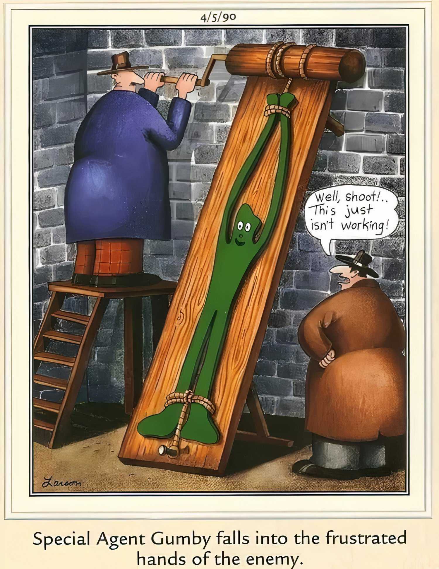 Este es un raro Lado lejano Desplácese que combina hilarantemente dos propiedades de la cultura pop en una broma increíble. Al igual que la forma en que James Bond a menudo es capturado e interrogado por los malos, un agente secreto se pone en un estante para ser torturado. Desafortunadamente para los villanos, el agente especial en cuestión es en realidad Gumby, el personaje flexible hecho de arcilla que no puede ser lastimado por ser estirado. Combinar la ficción de espías con los dibujos animados de los niños no es una vista normal, pero Para Gary Larson, es solo otro día en la tierra retorcida de El lado lejano.
