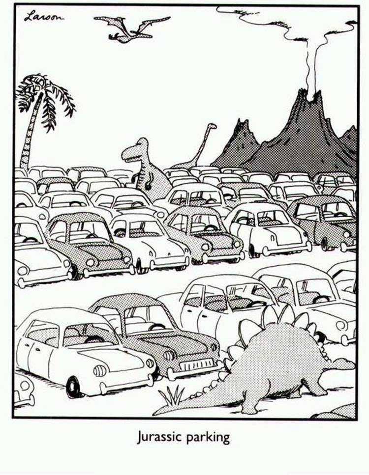 A veces, el juego de palabras simple puede ser lo mejor Lado lejano tiras. Todos saben sobre la maravilla y la emoción de Parque Jurásico. Pero Larson cambia las cosas y ataca a un ‘ing’ al final del título de la película para crear ‘estacionamiento jurásico’. El resultado final? Un estacionamiento lleno de gente donde los dinosaurios como un Stegosaurus y T. Rex deambulan gratis. Es un juego de palabras simple, pero que funciona muy bien. Los estacionamientos ya son una pesadilla y, En el lado lejano, lo único peor es tener que navegar alrededor de una bestia prehistórica grande.