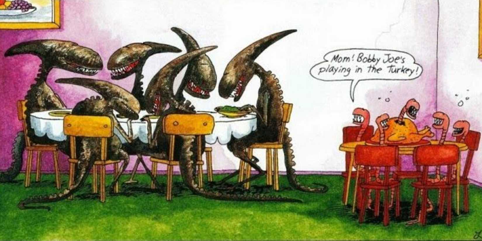 Una de las parodias de películas de acción más directas e hilarantes que Larson ha puesto al otro lado involucra a la clásica película Monster, los Xenomorphs. Aquí, los extraterrestres titulares de Alien se sientan a cenar con los extraterrestres completamente cultivados en la mesa ‘adulta’, mientras que un grupo de chestbursters está en la mesa de ‘niños’. Fiel a la vida, uno de los jóvenes se tacka a los adultos cuando otro Chestburster juega con su comida saliendo de su pavo. Es un hilarante y, afortunadamente, Parodia mucho menos horrible de uno de los Extranjero Los momentos más infames de la franquicia.